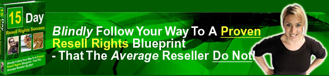 It doesn't matter if it is 2am in the morning right now, because the delivery process is automated, which means that you can get a copy of my manual within minutes after making your purchase of $37 via Credit Card secure server in the Order Button below. It will be fascinating indeed, because it is not a "Fear Factor" dish I will serving you one page away from here, but you may just want to give me 10% of your profits as a Thank You Note after you've followed the 15 Days Resell Rights plan. But the bottom line is that, there is finally a success map for the resellers that you can just blindly follow, because I have personally followed and reaped the rewards of this plan with my eyes open all the time. Now, close one eye and click on the Order Button now.