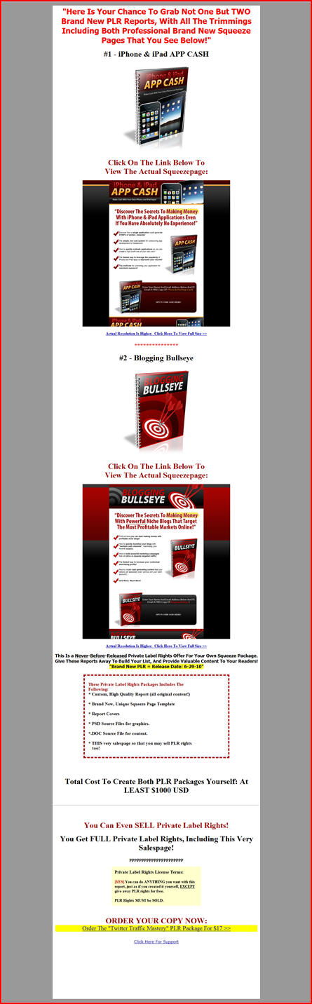 These Private Label Rights Packages Includes The Following: * Custom, High Quality Report (all original content!) * Brand New, Unique Squeeze Page Template * Report Covers * PSD Source Files for graphics. *.DOC Source File for content. * THIS very salespage so that you may sell PLR rights too! |