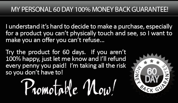 I understand my purchase is completely protected by your name’s 100% satisfaction money-back guarantee. I have 60 days to test drive the techniques and strategies presented in Promotable Now! and if I am not completely convinced that it is hands-down the best self promotion information on the market, then I am entitled to a 100% refund of my purchase price
