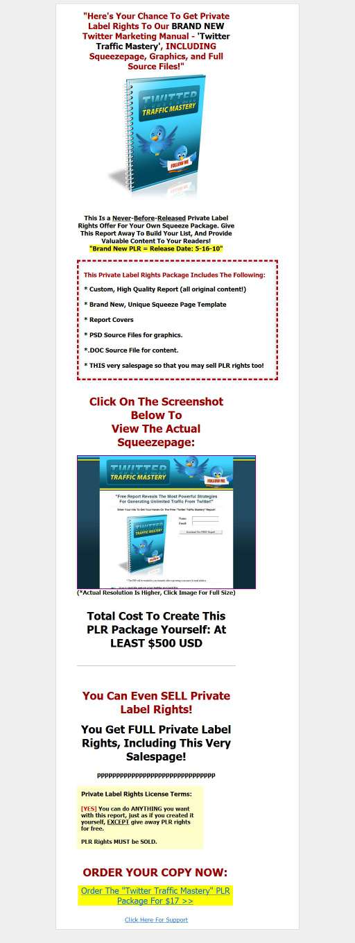This Private Label Rights Package Includes The Following: * Custom, High Quality Report (all original content!) * Brand New, Unique Squeeze Page Template * Report Covers * PSD Source Files for graphics. *.DOC Source File for content. * THIS very salespage so that you may sell PLR rights too! |