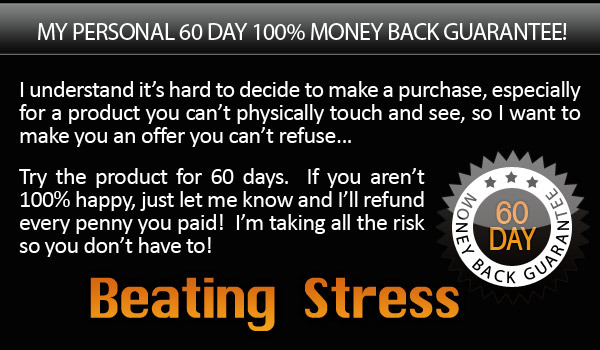 I understand my purchase is completely protected by your name’s 100% satisfaction money-back guarantee. I have 60 days to test drive the techniques and strategies presented in Beating Stress and if I am not completely convinced that it is hands-down the best thriving on stress information on the market, then I am entitled to a 100% refund of my purchase price.