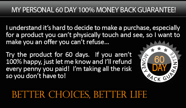 I understand my purchase is completely protected by your name’s 100% satisfaction money-back guarantee. I have 60 days to test drive the techniques and strategies presented in Better Choices, Better Life and if I am not completely convinced that it is hands-down the best health and happiness information on the market, then I am entitled to a 100% refund of my purchase price.