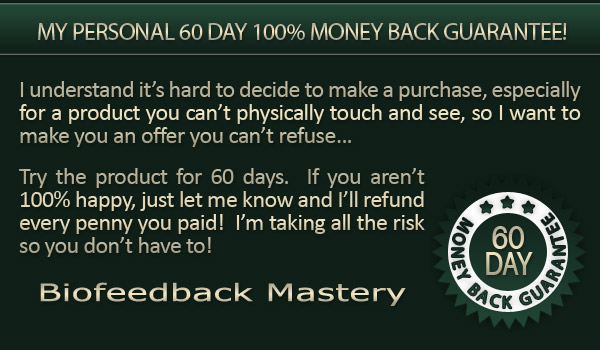 I understand my purchase is completely protected by your name’s 100% satisfaction money-back guarantee. I have 60 days to test drive the techniques and strategies presented in Biofeedback Mastery and if I am not completely convinced that it is hands-down the best biofeedback information on the market, then I am entitled to a 100% refund of my purchase price.