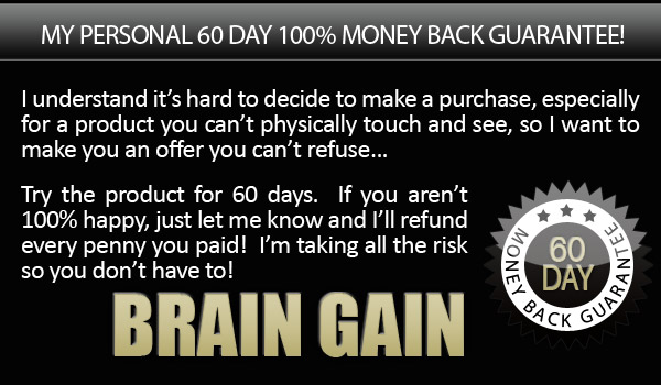 I understand my purchase is completely protected by your name’s 100% satisfaction money-back guarantee. I have 60 days to test drive the techniques and strategies presented in Brain Gain and if I am not completely convinced that it is hands-down the best brain enhancement information on the market, then I am entitled to a 100% refund of my purchase price.