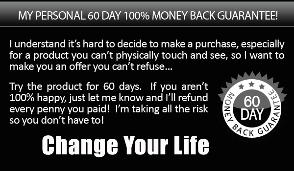 I understand my purchase is completely protected by your name’s 100% satisfaction money-back guarantee. I have 60 days to test drive the techniques and strategies presented in Change Your Life and if I am not completely convinced that it is hands-down the best self development information on the market, then I am entitled to a 100% refund of my purchase price.