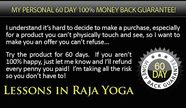 I understand my purchase is completely protected by your name’s 100% satisfaction money-back guarantee. I have 60 days to test drive the techniques and strategies presented in Lessons in Raja Yoga and if I am not completely convinced that it is hands-down the best raja yoga instruction book on the market, then I am entitled to a 100% refund of my purchase price.