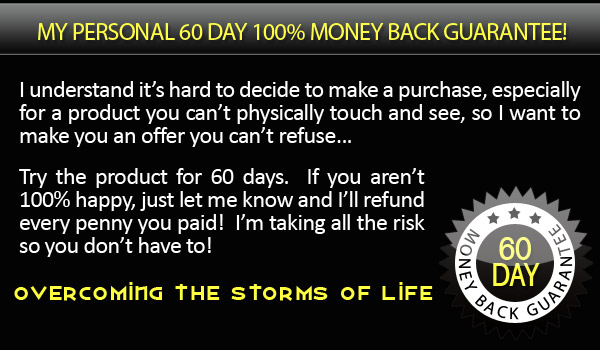 I understand my purchase is completely protected by your name’s 100% satisfaction money-back guarantee. I have 60 days to test drive the techniques and strategies presented in Overcoming The Storms Of Life and if I am not completely convinced that it is hands-down the best empowerment information on the market, then I am entitled to a 100% refund of my purchase price.