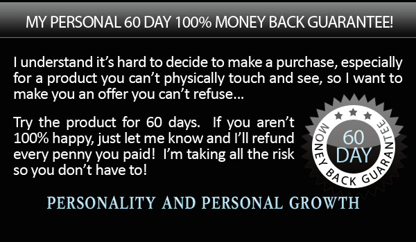 I understand my purchase is completely protected by your name’s 100% satisfaction money-back guarantee. I have 60 days to test drive the techniques and strategies presented in Personality and Personal Growth and if I am not completely convinced that it is hands-down the best personal growth information on the market, then I am entitled to a 100% refund of my purchase price.