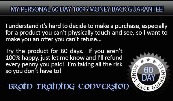 I understand my purchase is completely protected by your name’s 100% satisfaction money-back guarantee. I have 60 days to test drive the techniques and strategies presented in The Brain Training Conversion and if I am not completely convinced that it is hands-down the best brain training.