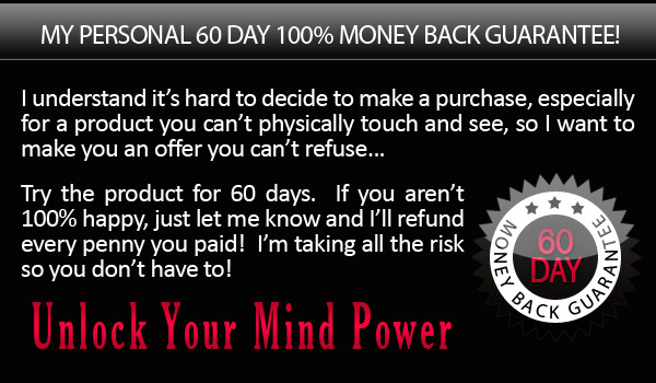 I understand my purchase is completely protected by your name’s 100% satisfaction money-back guarantee. I have 60 days to test drive the techniques and strategies presented in Unlock Your Mind Power and if I am not completely convinced that it is hands-down the best unleashing the power of your mind information on the market, then I am entitled to a 100% refund of my purchase price.
