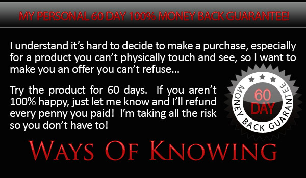 I understand my purchase is completely protected by your name’s 100% satisfaction money-back guarantee. I have 60 days to test drive the techniques and strategies presented in Ways Of Knowing and if I am not completely convinced that it is hands-down the best development of voice and mind information on the market, then I am entitled to a 100% refund of my purchase price.