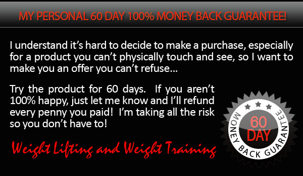 I understand my purchase is completely protected by your name’s 100% satisfaction money-back guarantee. I have 60 days to test drive the techniques and strategies presented in Weight Lifting and Weight Training and if I am not completely convinced that it is hands-down the best athletic information on the market, then I am entitled to a 100% refund of my purchase price.