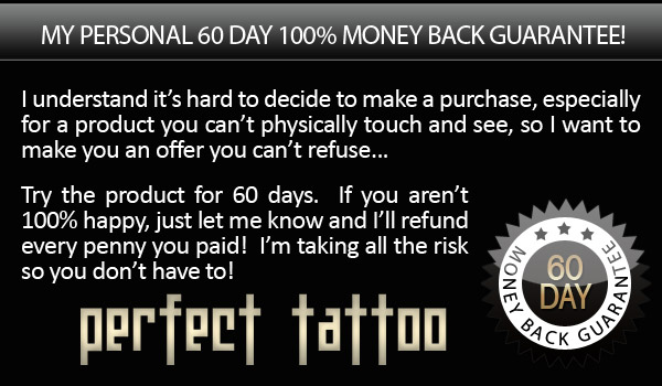 I understand my purchase is completely protected by your name’s 100% satisfaction money-back guarantee. I have 90 days to test drive the techniques and strategies presented in Perfect Tattoo and if I am not completely convinced that it is hands-down the best tattoo information on the market, then I am entitled to a 100% refund of my purchase price.