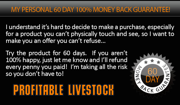 I understand my purchase is completely protected by your name’s 100% satisfaction money-back guarantee. I have 60 days to test drive the techniques and strategies presented in Profitable Livestock and if I am not completely convinced that it is hands-down the best livestock and poultry care book on the market, then I am entitled to a 100% refund of my purchase price.