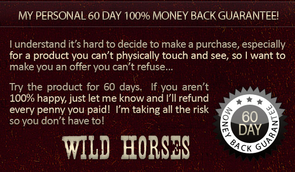 I understand my purchase is completely protected by your name______’s 100% satisfaction money-back guarantee. I have 60 days to test drive the techniques and strategies presented in The Art of Taming and Training Wild Horses and if I am not completely convinced that it is hands-down the best taming and training wild horses book on the market, then I am entitled to a 100% refund of my purchase price.